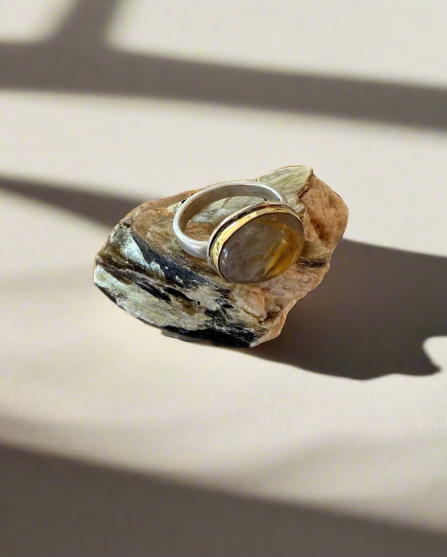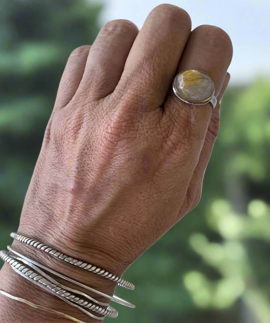 Golden rutilated quartz shimmers with threads of light, each strand suspended within like captured sunbeams. Set in a warm brass bezel on top of sterling silver, the stone is complemented by a medium-width band for a timeless, balanced feel.