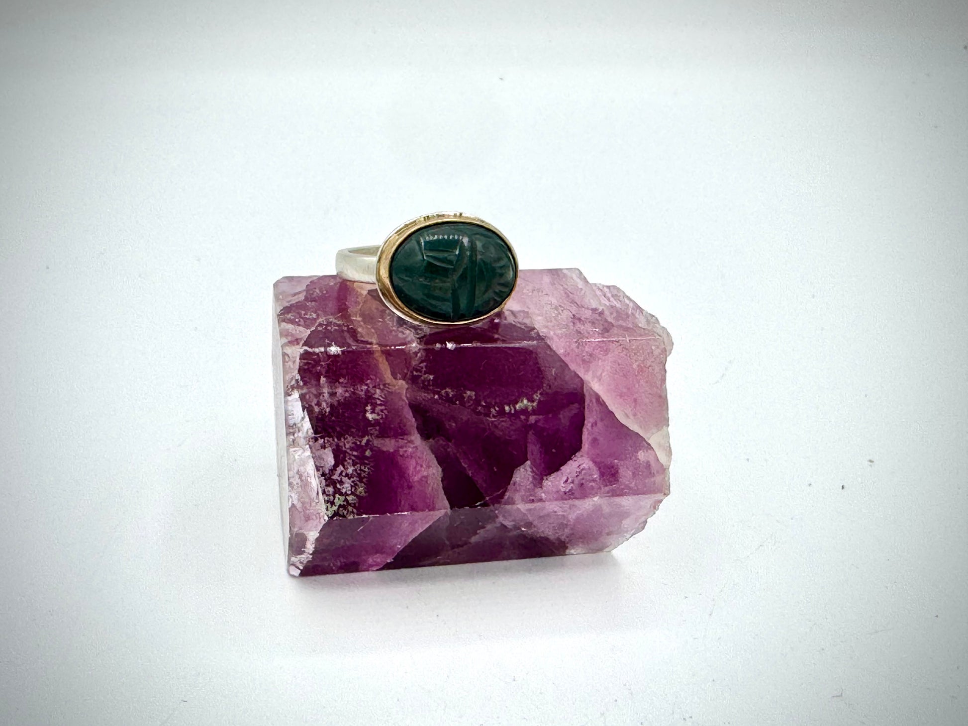 A carved scarab in rich green bloodstone rests within a warm brass bezel. Flecked with red, the stone is set on top of sterling silver with a medium-width band. Bloodstone, known for its healing, protective qualities, and vitality, fosters renewal and shields the wearer from negativity. The scarab, an ancient symbol of rebirth and good fortune, brings a powerful story of transformation and strength to this unique piece.