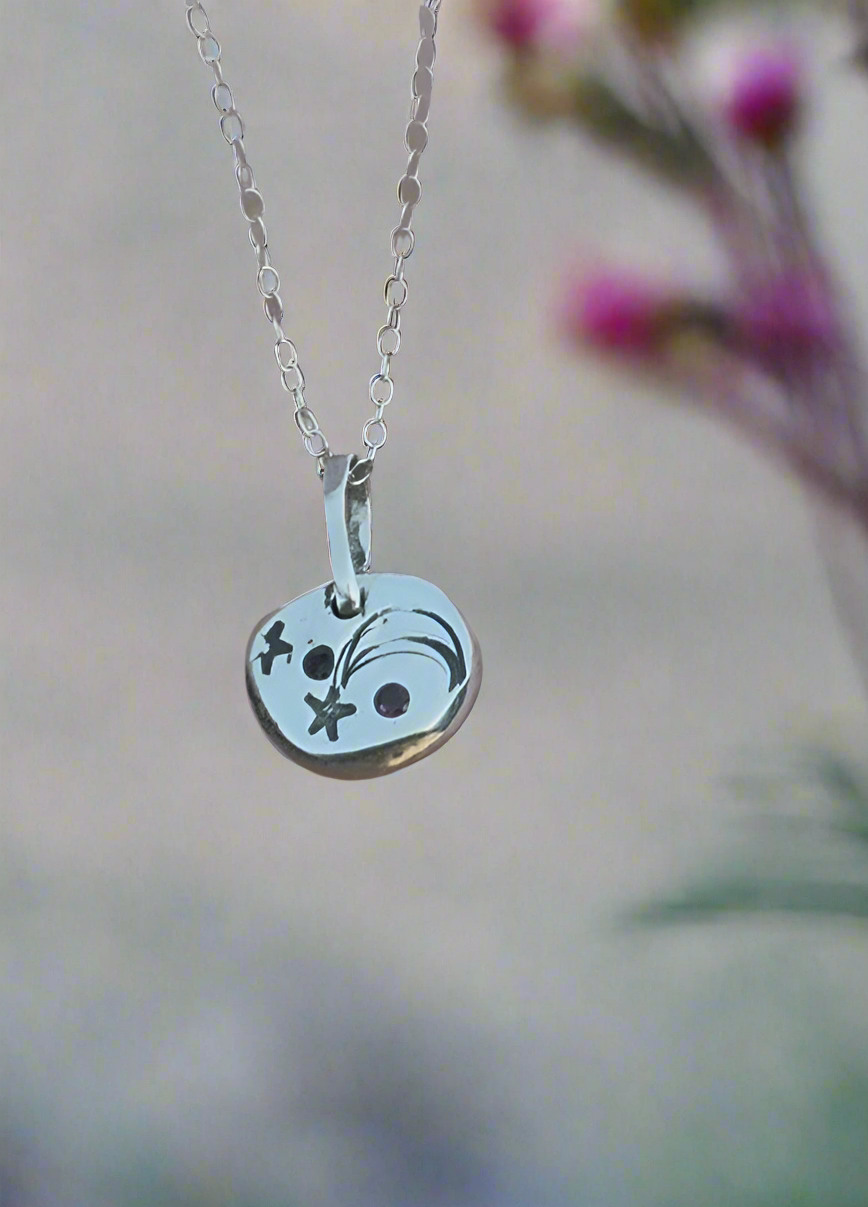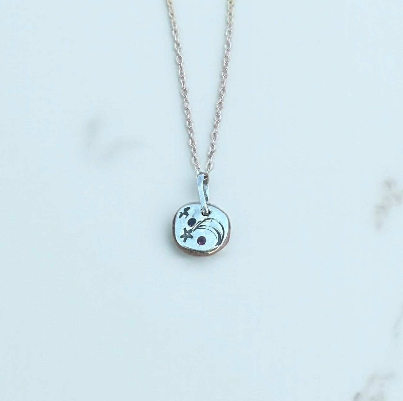 This petite one-of-a-kind silver medallion, just a half inch across, holds quiet magic in its surface. I call it a must since it perfectly imperfect, not symmetrical. Two glowing pink tourmalines rest alongside a celestial scene of stars and a crescent moon, a gentle reminder to wish upon a star and trust in the dreams you set free. This little charm carries strength and hope, whispering that the wishes you make are yours to bring to life.