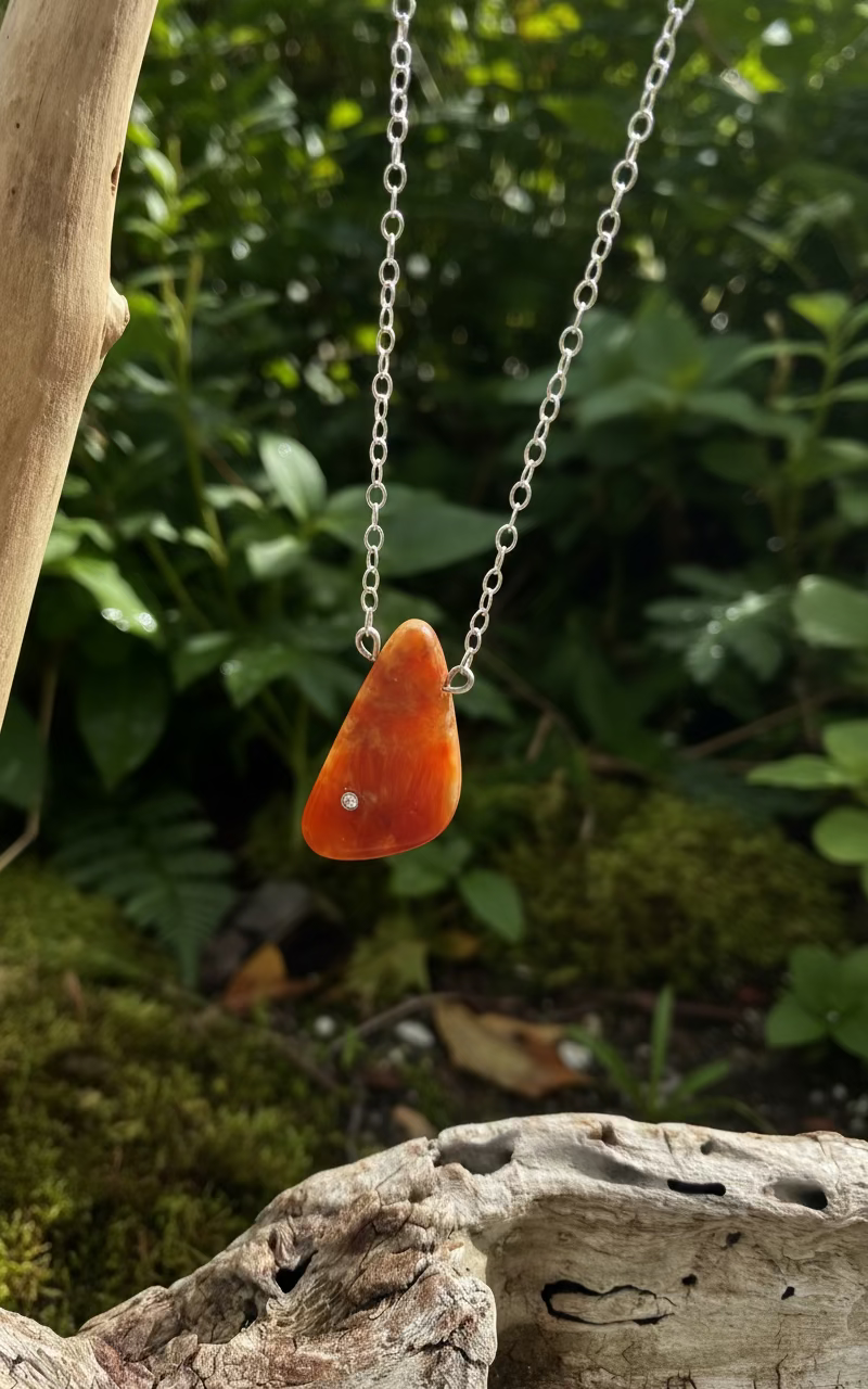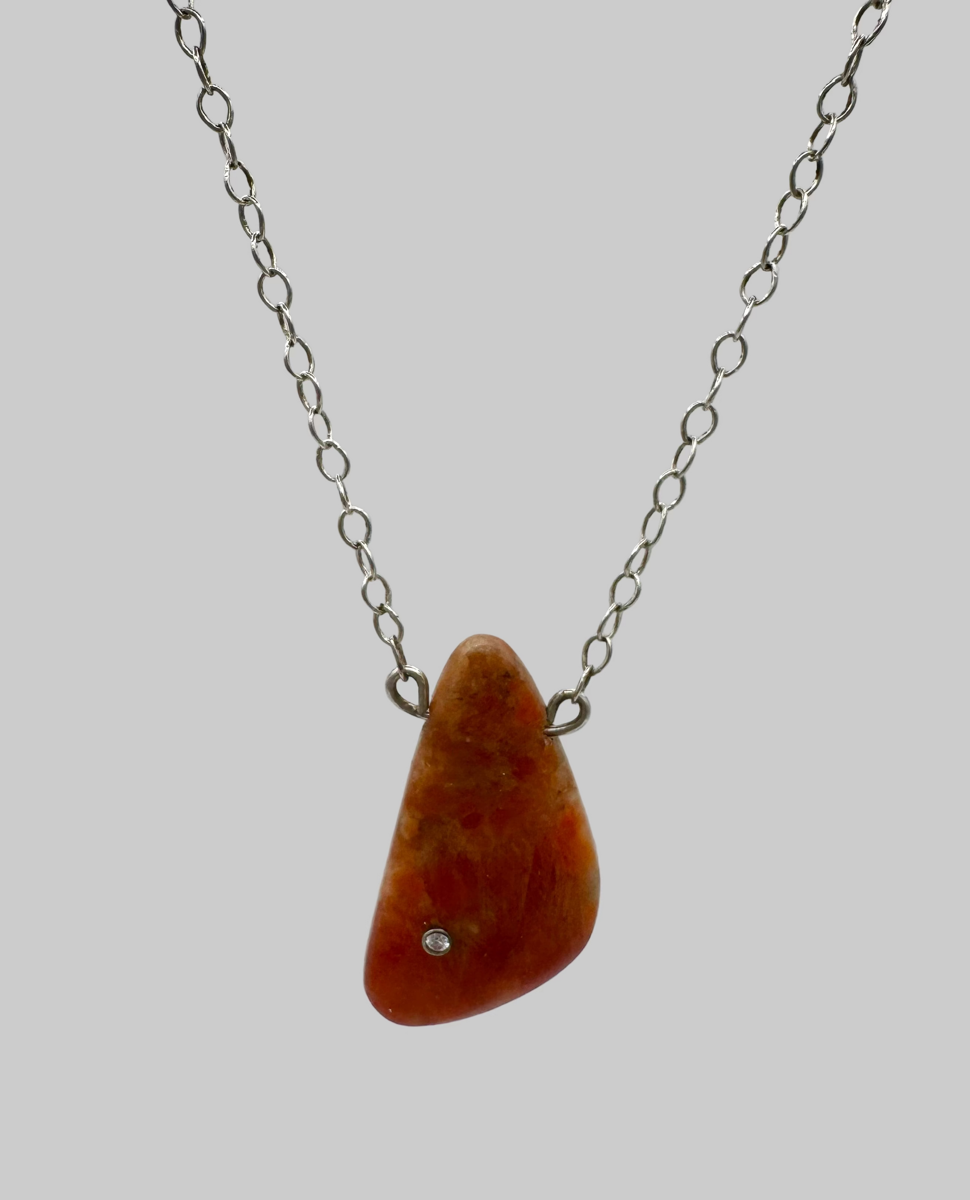 Radiating warmth and quiet strength, this pendant features a natural orange jasper stone with a single white sapphire set in a sterling-silver bail. Suspended on a sterling silver chain, the piece feels both modern and timeless — a quiet statement of strength and light.